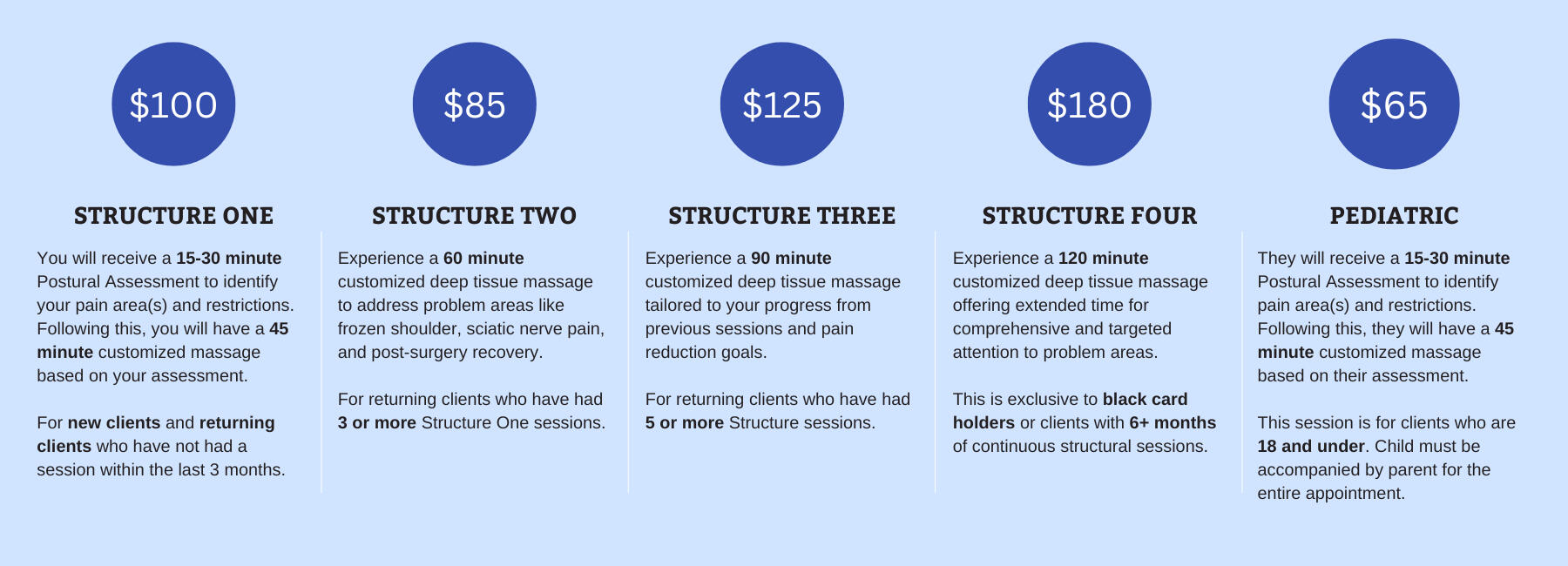 You will receive a 15-30 minute Postural Assessment to identify your pain area(s) and restrictions. Following this, you will have a 45 minute customized massage based on your assessment.